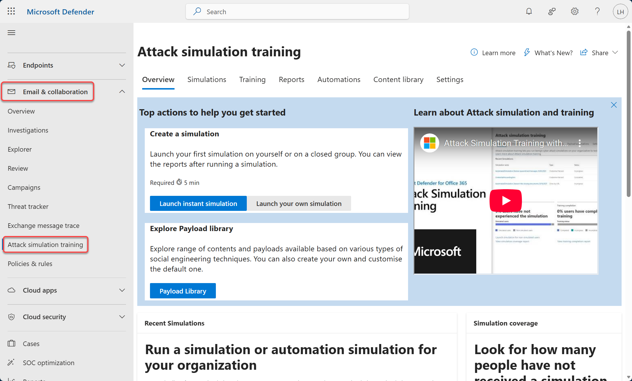 Truy cập Defender portal ở địa chỉ https://security.microsoft.com, chọn Email & Collaboration > Attack Simulation Training.