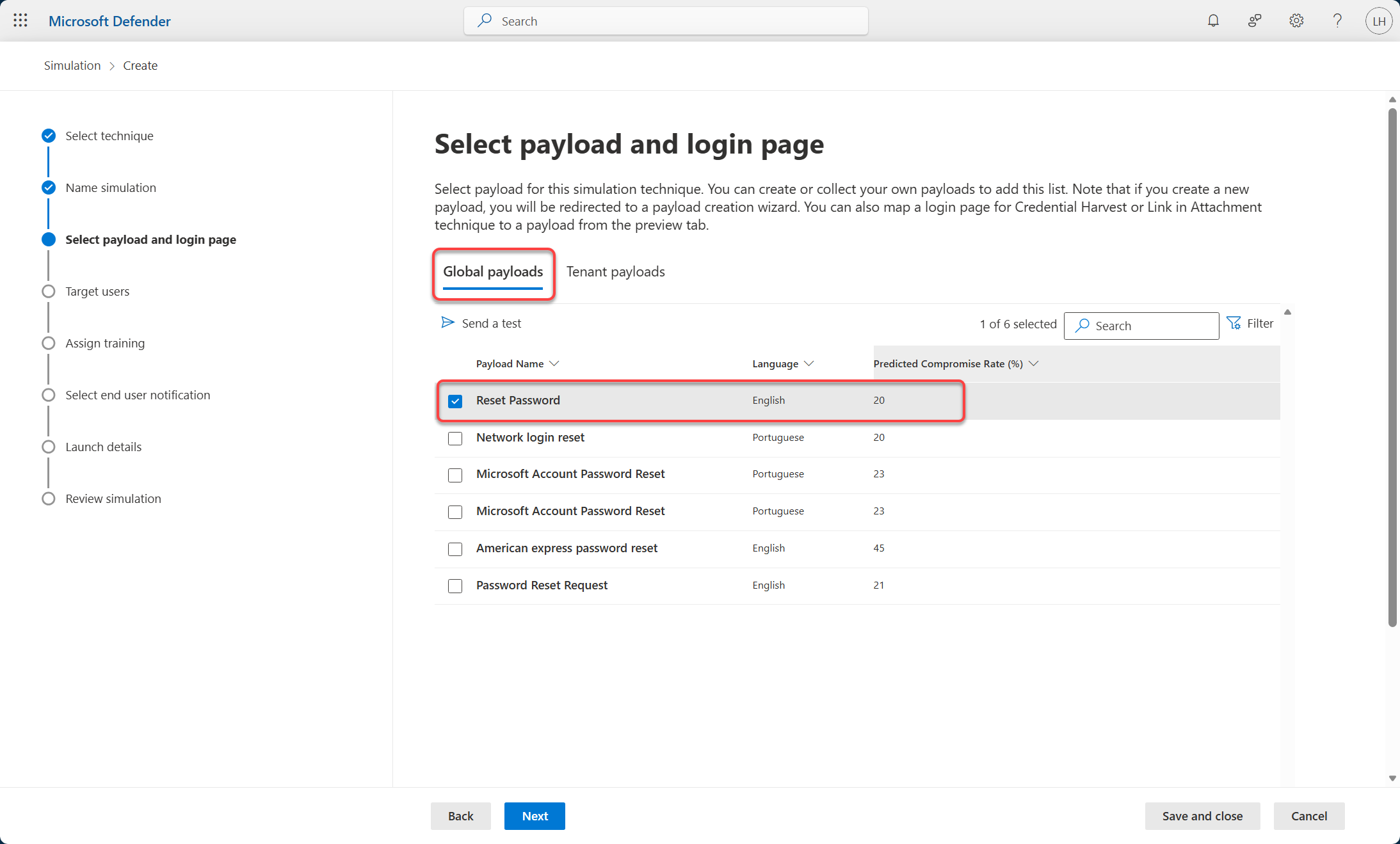 Chọn payload để tấn công gồm Global payloads (các nội dung tấn công dùng chung do Microsoft cung cấp) và Tenant payloads (các nội dung tấn công do tổ chức tự thiết kế).
