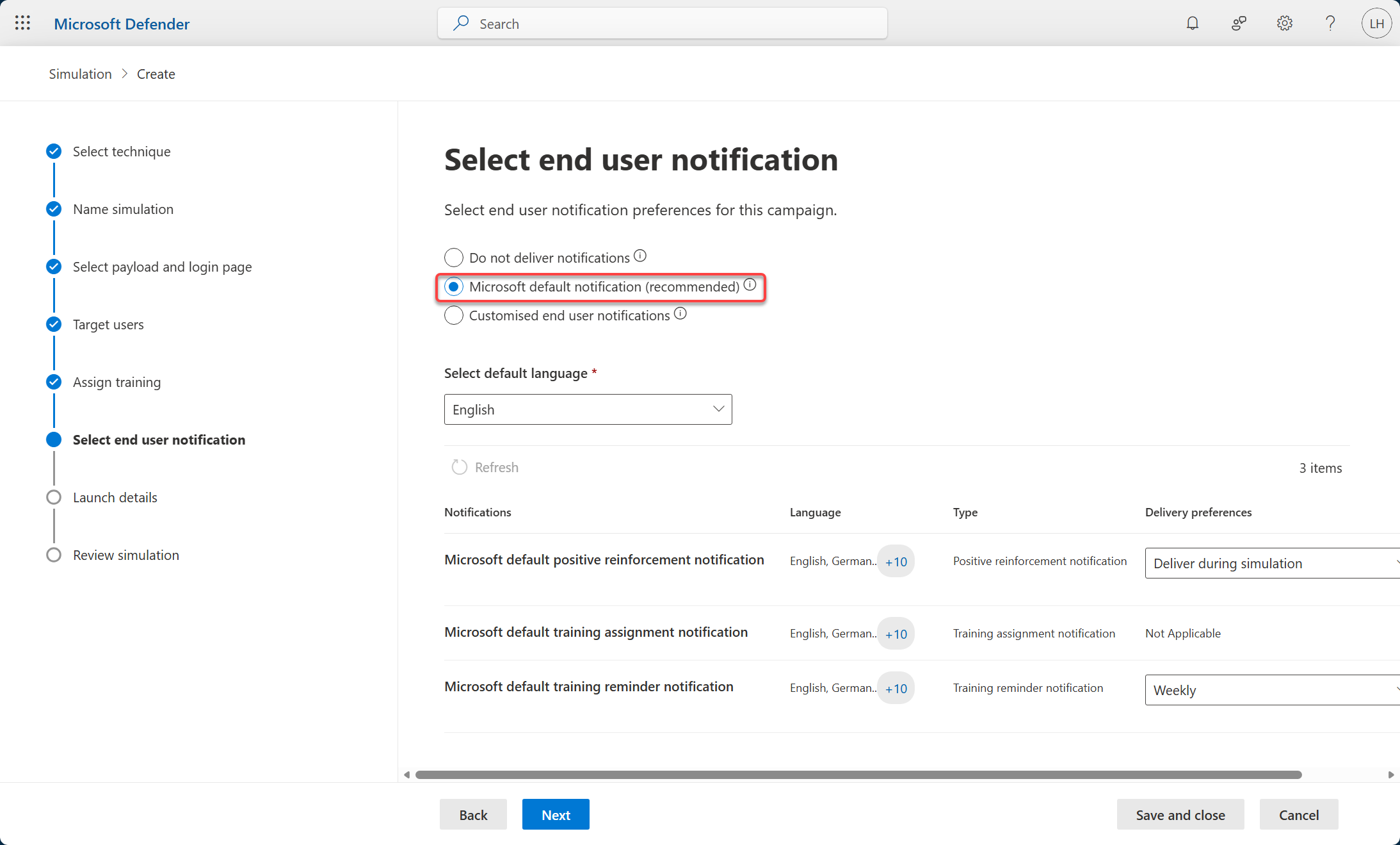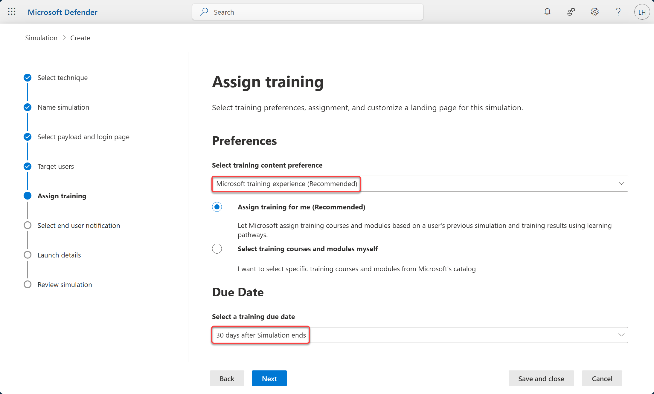 • Microsoft training experience (Recommended): người dùng sẽ được dẫn vào trải nghiệm đào tạo tích hợp sẵn của Microsoft với 2 lựa chọn chính là Assign training for me (Recommended) – Microsoft tự gán khoá học dựa trên kết quả mô phỏng & lịch sử training của người dùng; hoặc Select training courses and modules myself – bạn tự chọn các course/module trong kho training của Microsoft.