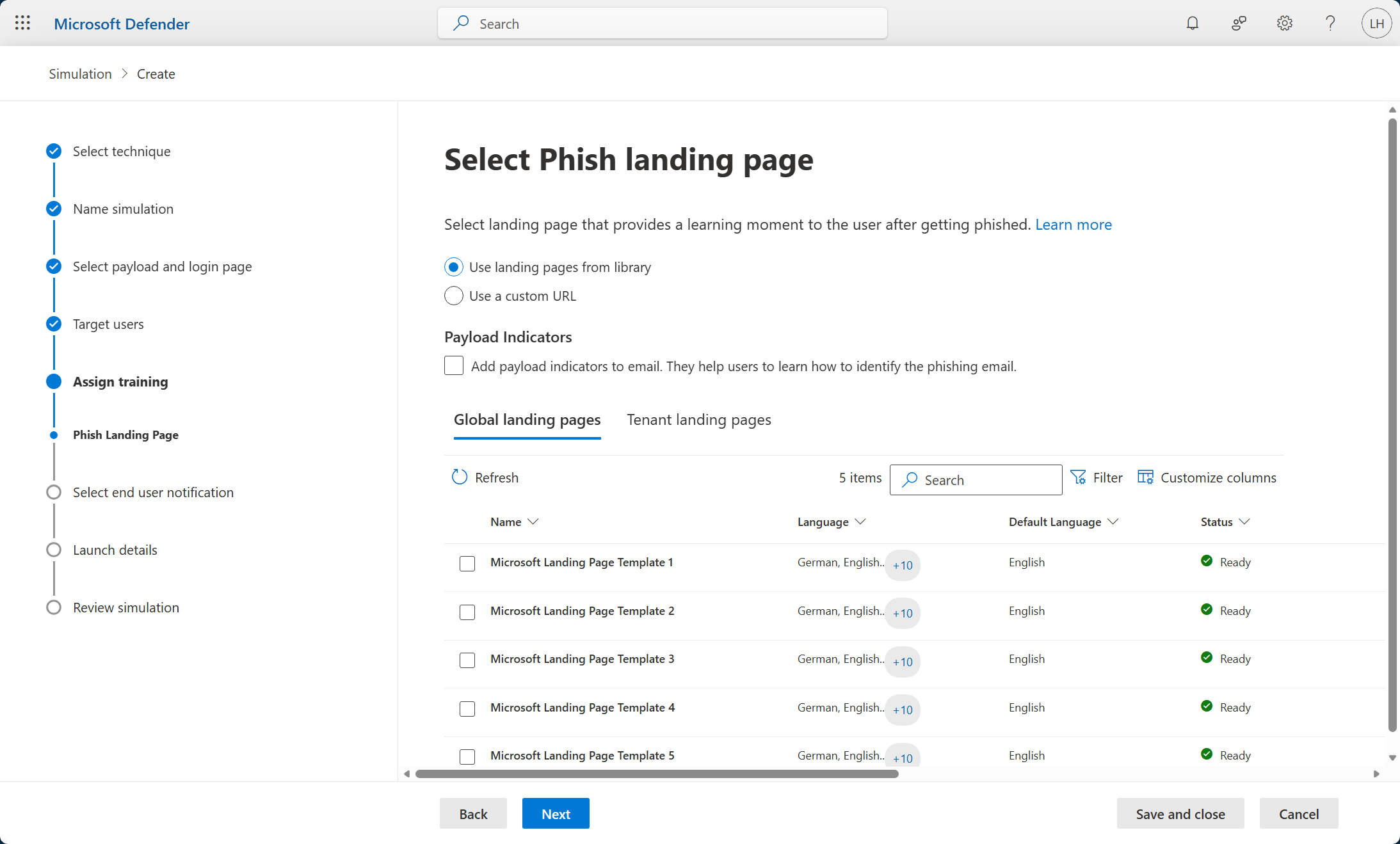 Chọn Use landing pages from libraries và chọn một mẫu có sẵn trong mục Global landing pages