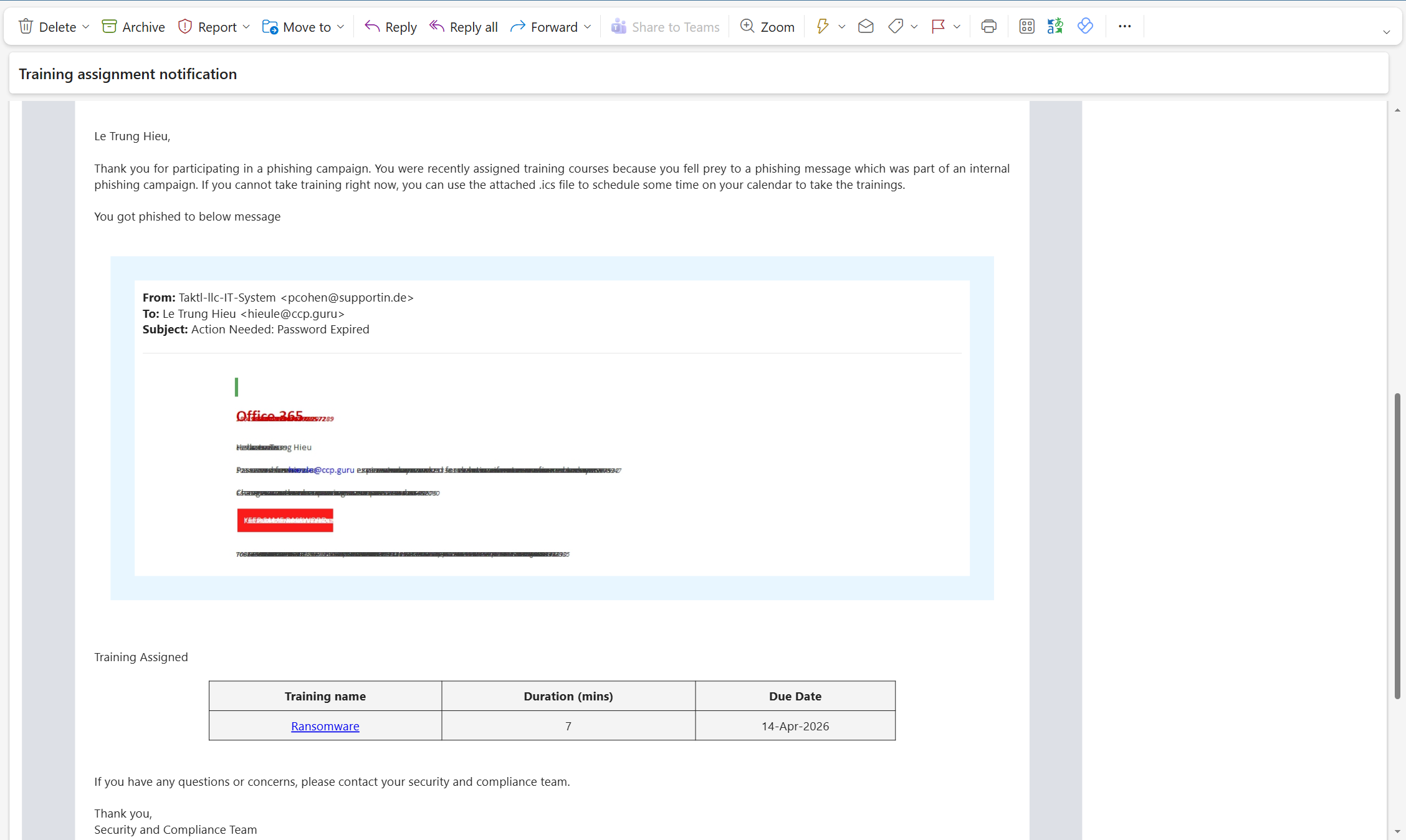 • Microsoft default training assignment notification: thông báo được gán khóa đào tạo nhận thức an toàn thông tin