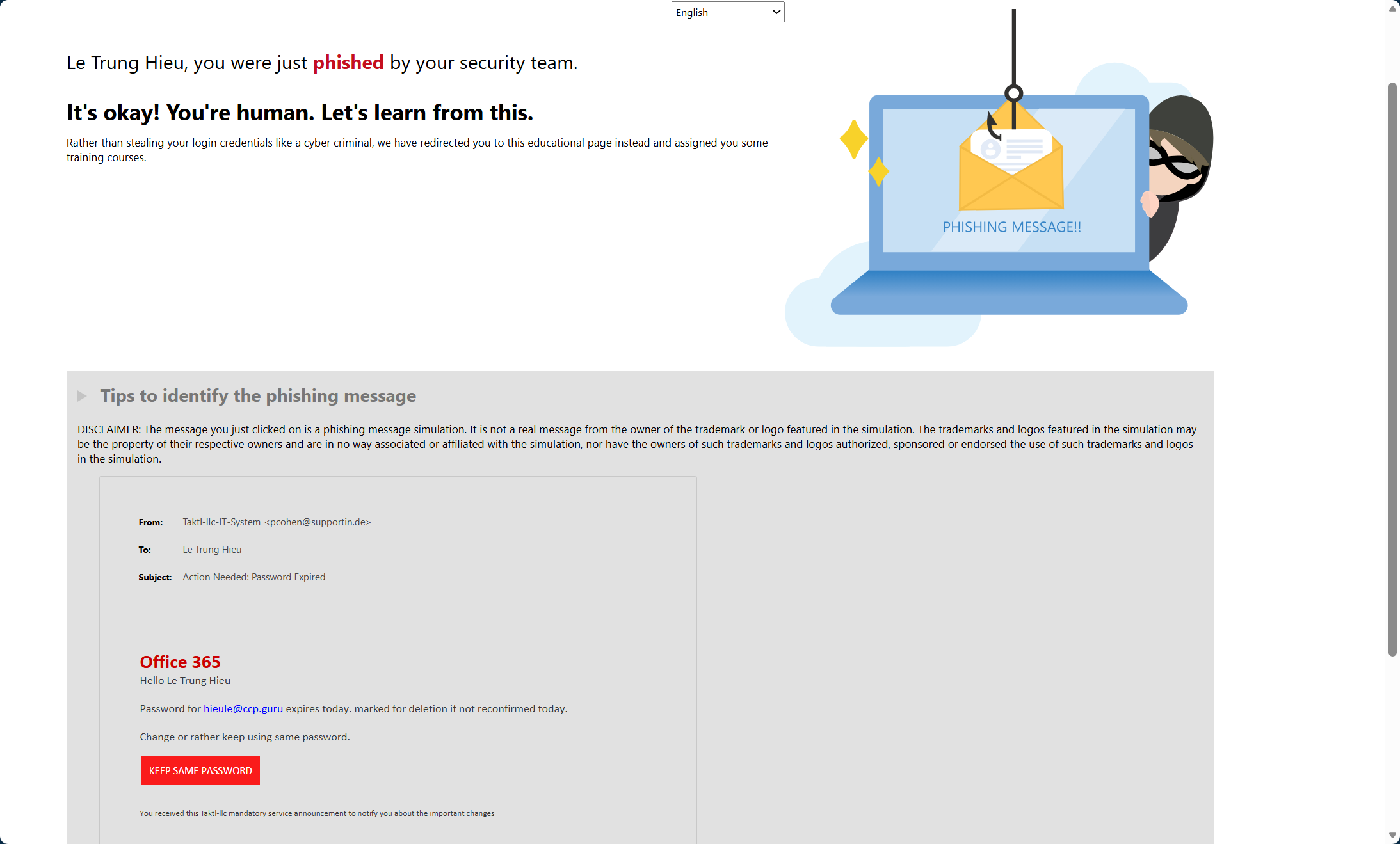 • Microsoft default positive reinforcement notification: thông báo khen thưởng khi báo cáo phish mô phỏng