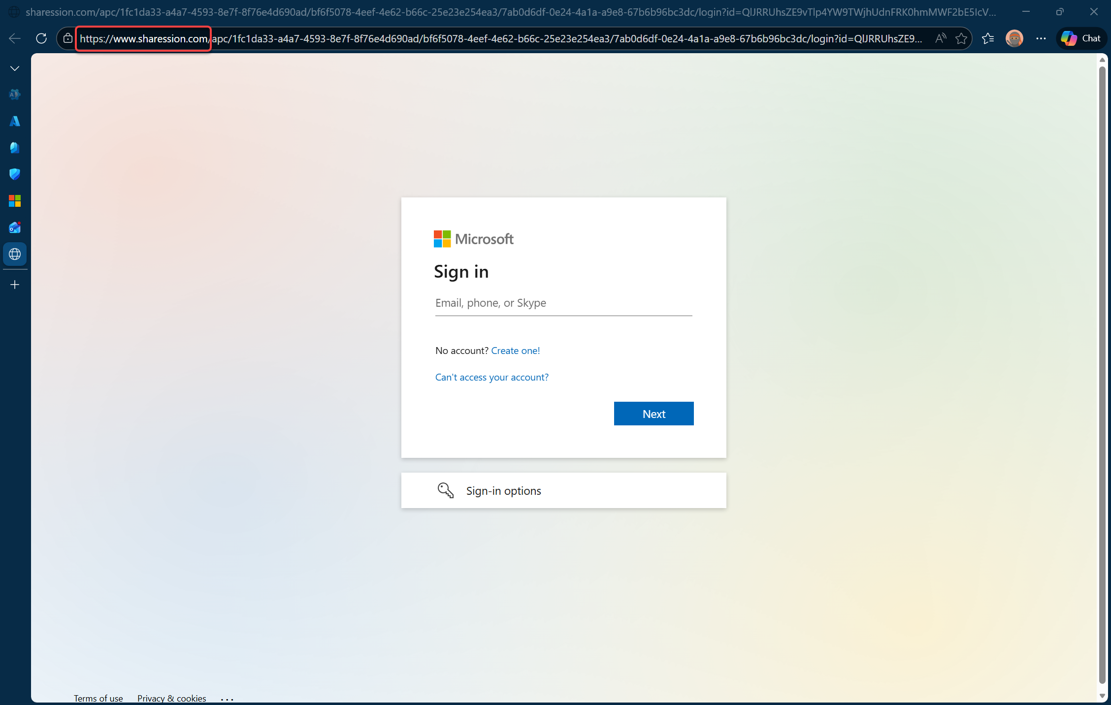 Khi bạn nhấn vào liên kết sẽ xuất hiện trang đăng nhập tài khoản Microsoft, nhưng có đường dẫn lạ, không phải chính thức của Microsoft.