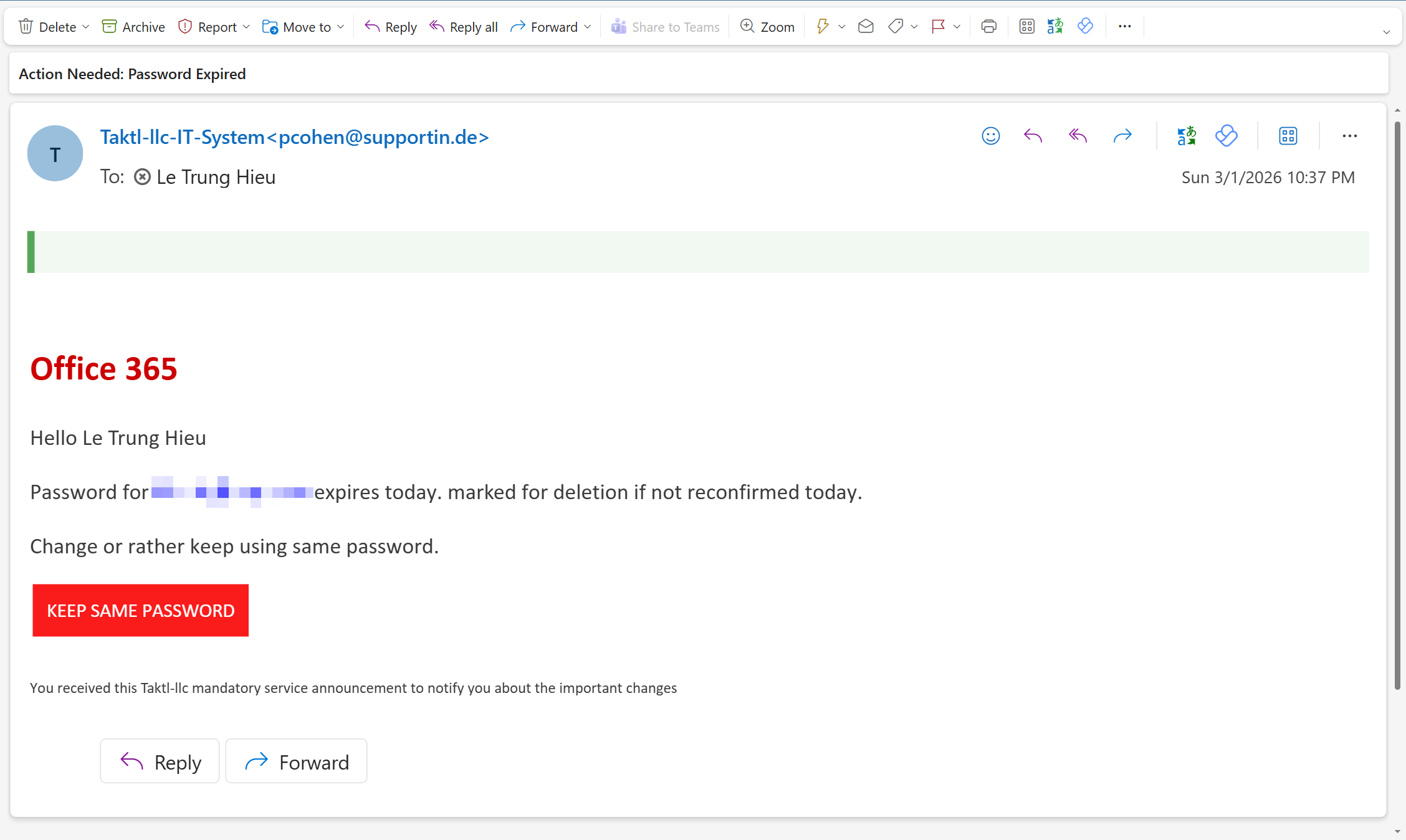 • Tên hiển thị “Taktl-llc-IT-System” cũng lạ, không đúng kiểu thông báo chuẩn của Microsoft/IT nội bộ.