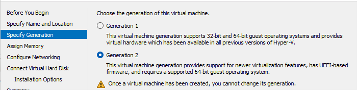 Các phương pháp tạo VM Gen2 thực hiện giống với cách thiết lập VM Gen1, ngoại trừ lựa chọn phiên bản thế hệ