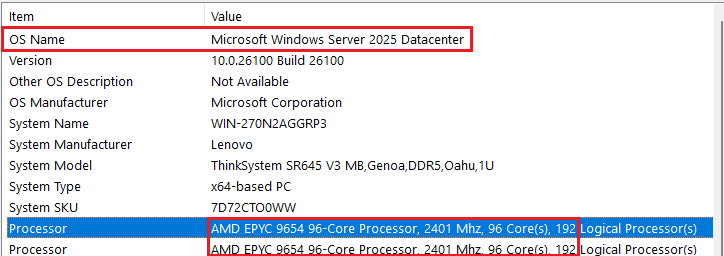 Các ví dụ dưới đây được lấy từ máy chủ được cấu hình với hai bộ xử lý AMD 96C và tổng số bộ xử lý logic là 384.