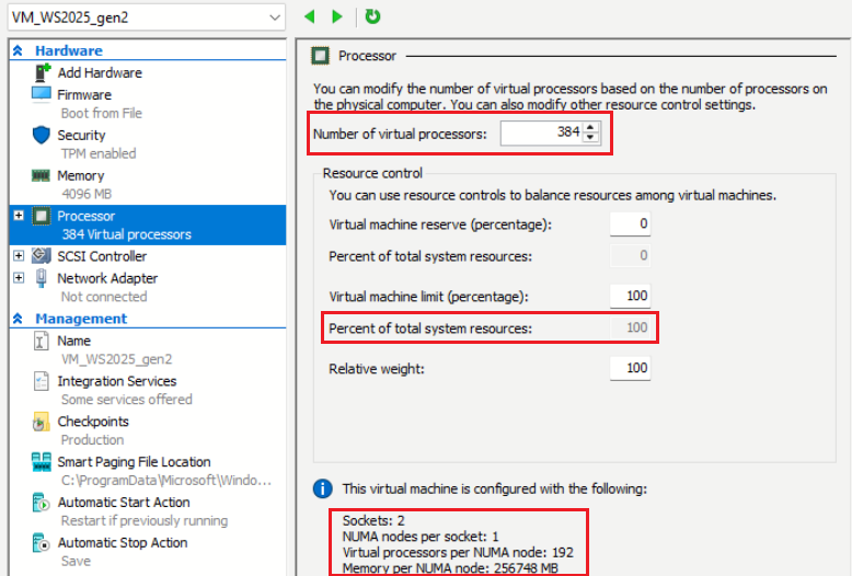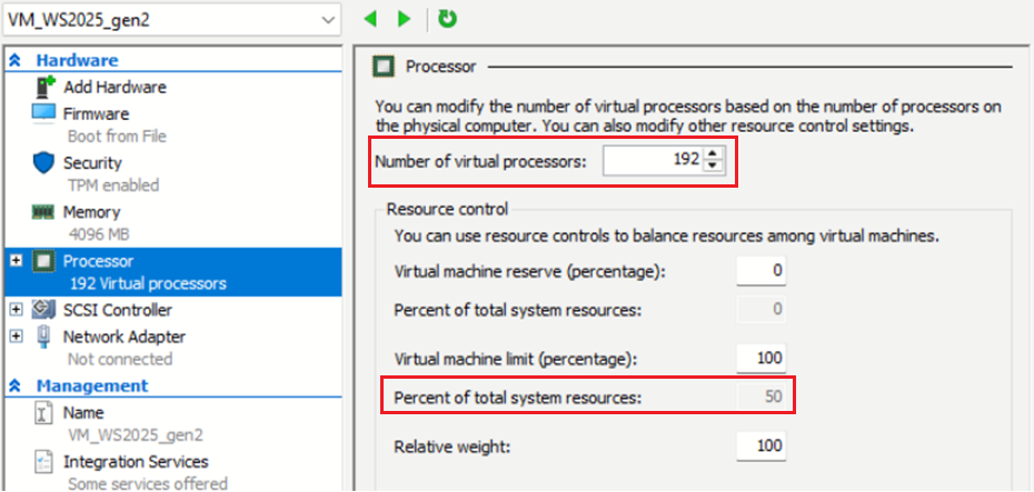 Thử tạo một VM Gen 2 bằng Hyper-V Manager. Sau khi tạo xong, hãy kiểm tra cài đặt bộ xử lý của máy ảo. Bạn sẽ thấy số lượng bộ xử lý ảo là 192 và phần trăm tổng tài nguyên hệ thống là 50%.