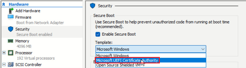 Chế độ khởi động Secure boot được bật mặc định cho VM Gen2 để giúp ngăn chặn việc chạy các phần mềm, hệ điều hành hoặc trình điều khiển UEFI trái phép khi khởi động. Bạn có thể sử dụng secure boot với các VM Gen2 chạy hệ điều hành Windows hoặc Linux. Đối với các máy ảo Linux Gen2 có chế độ khởi động an toàn, bạn cần chọn mẫu UEFI CA Secure Boot tại Settings Chọn Hardware, tiếp theo chọn Security trước khi kết nối hoặc khởi động VM