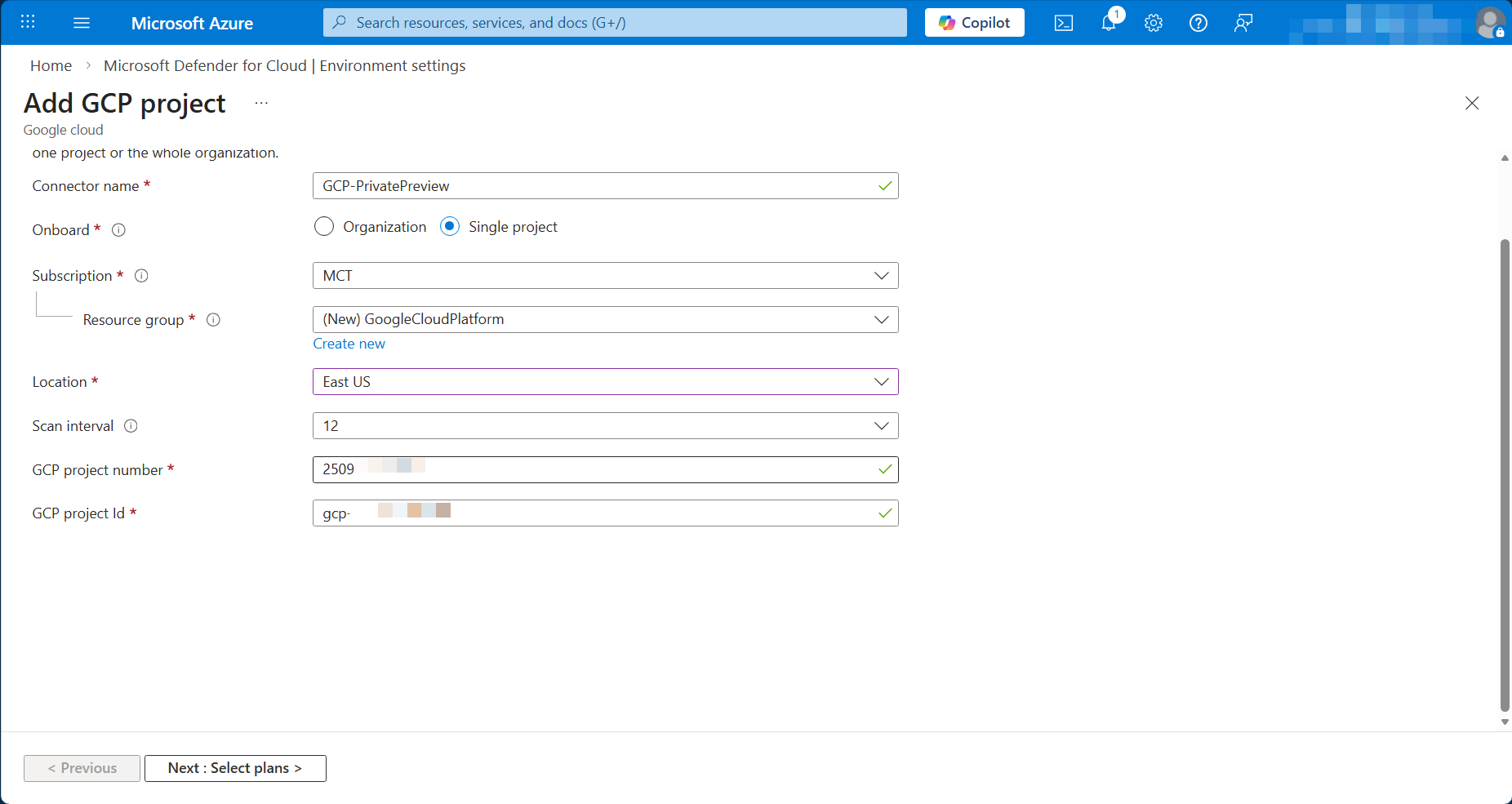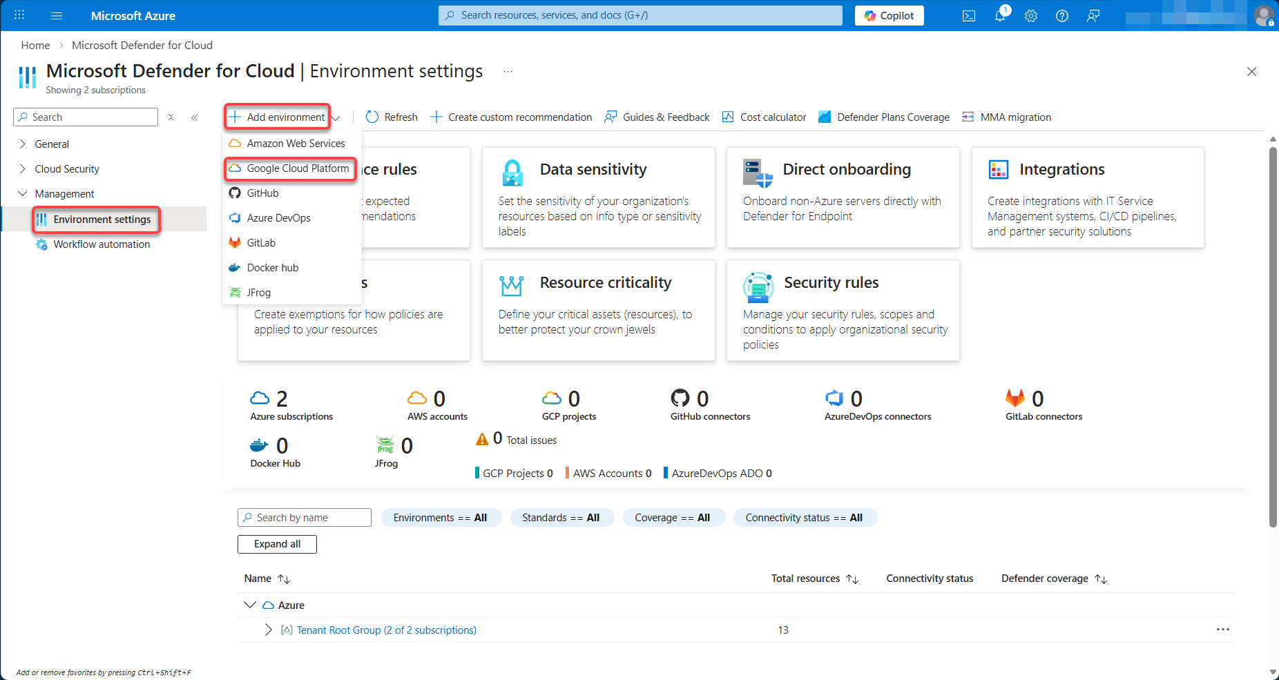 Trên portal Microsoft Azure (https://portal.azure.com/), tìm kiếm Microsoft Defender for Cloud và truy cập vào mục Environment settings > Add environment > Google Cloud Platform.