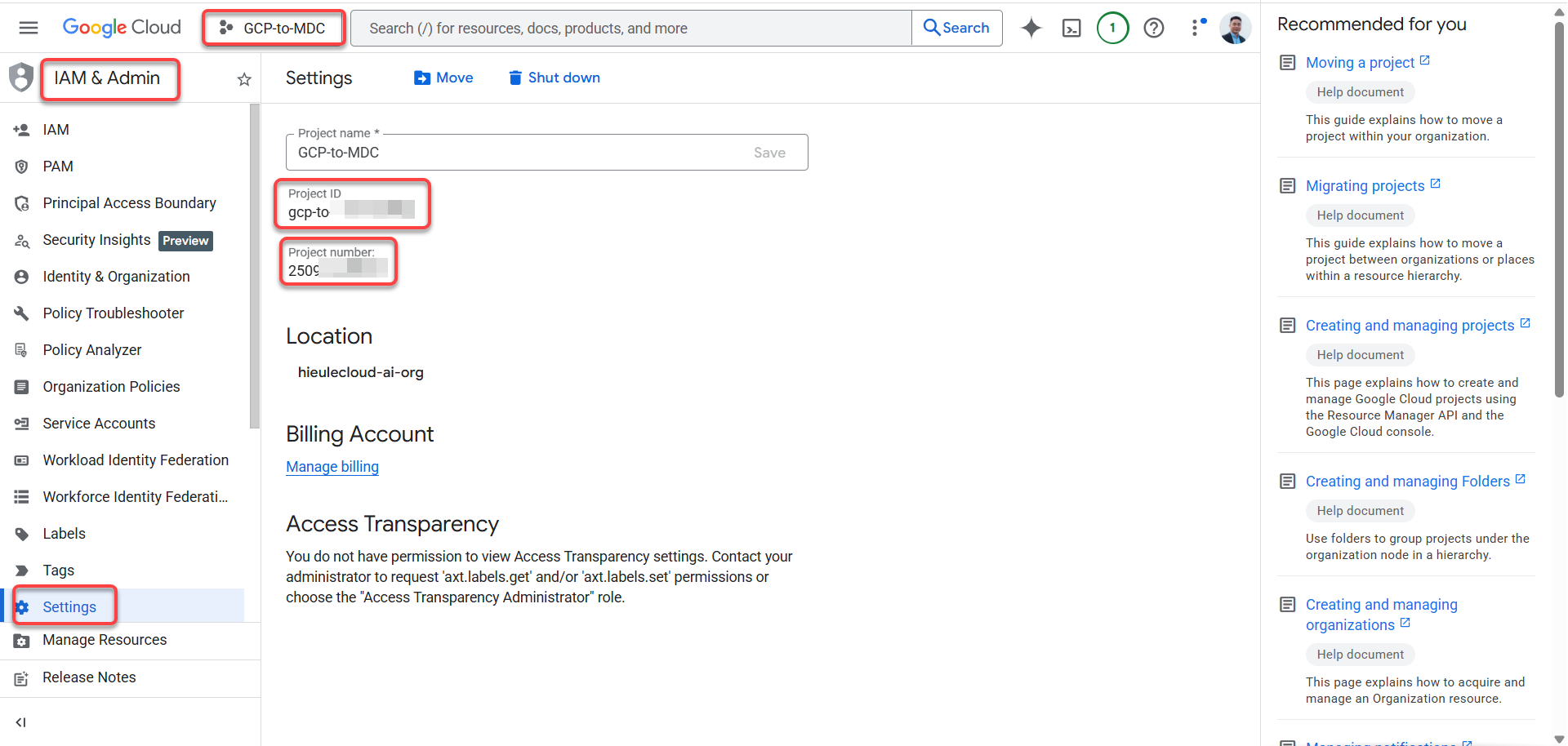 GCP project number and project ID có thể tìm thấy trên giao diện IAM & Admin > Settings của GCP.