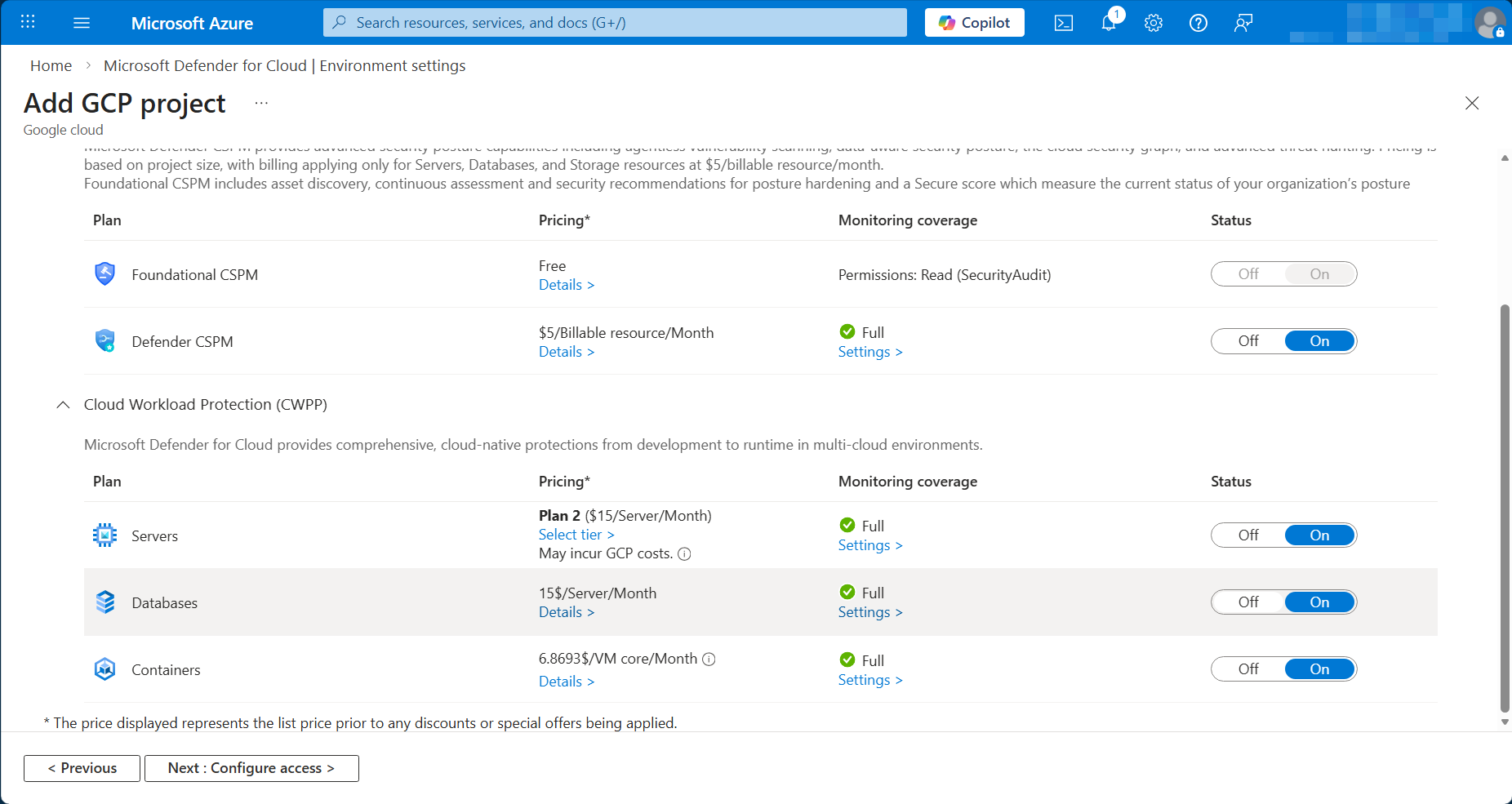 Chọn các gói MDC sẽ bảo vệ cho tài nguyên trên GCP như Defender CSPM và các Cloud Workload Protection (CWPP) như Servers, Databases, Containers. Việc lựa chọn chỉ đơn giản là chuyển thanh trượt sang ON hoặc OFF. Các lựa chọn này có thể thay đổi về sau dễ dàng.