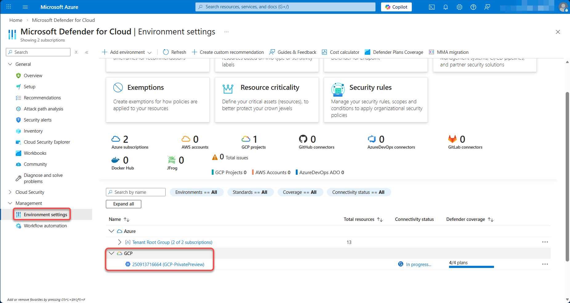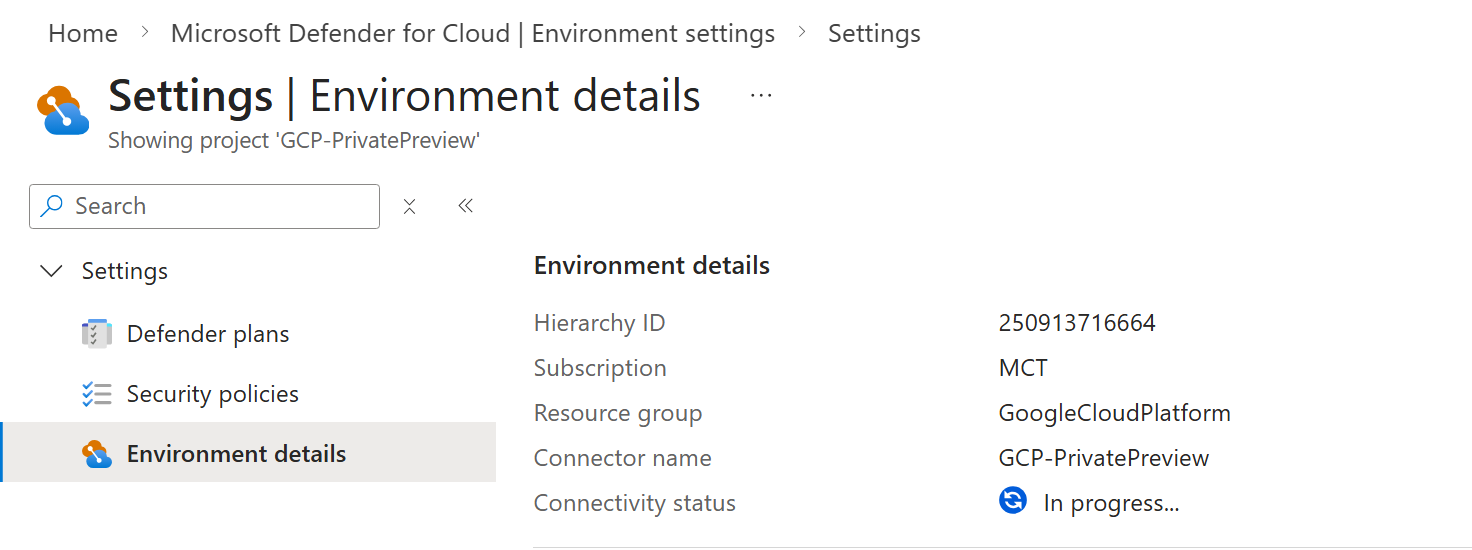 Trên giao diện của Defender for Cloud, vào Environment Settings sẽ thấy GCP project vừa tạo đã kết nối thành công.