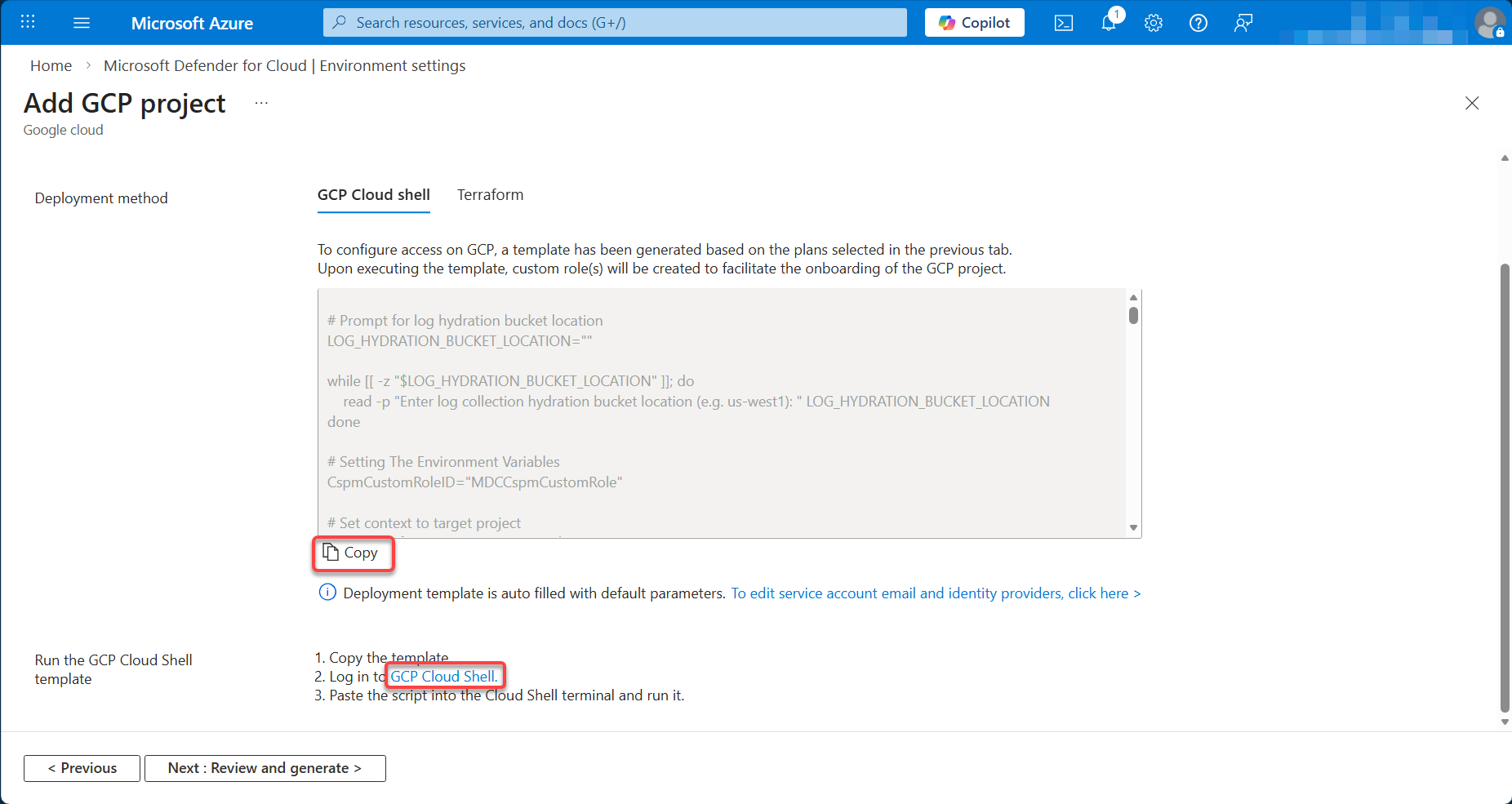 Sau khi hoàn tất quá trình chạy script trên Google Cloud shell, trở lại giao diện cấu hình trên Microsoft Azure chọn Review and generate > Create để tiến hành khởi tạo kết nối.