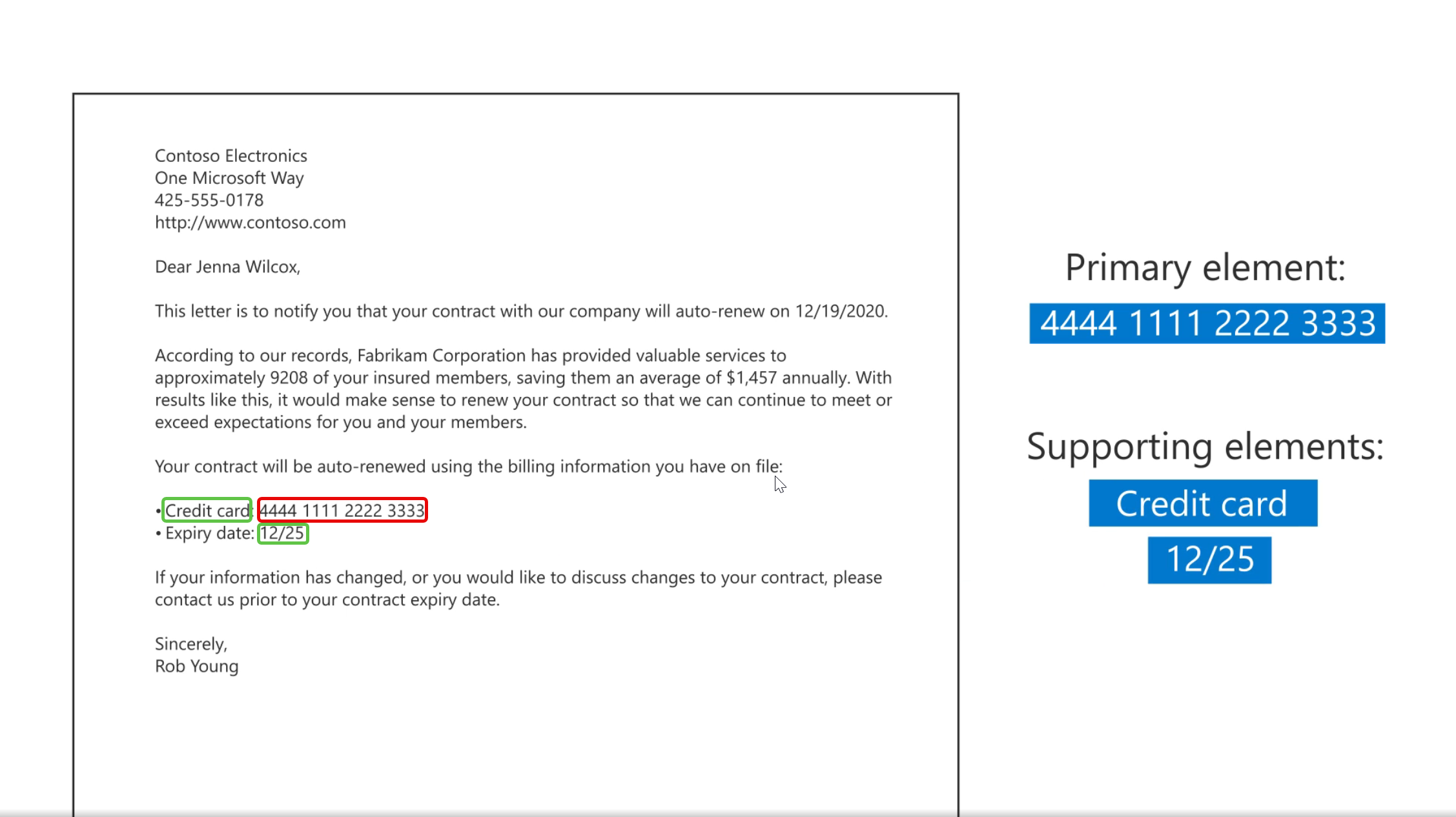 Các yếu tố bổ trợ giúp củng cố độ tin cậy cho kết quả nhận diện. Các yếu tố bổ trợ thường là những yếu tố xuất hiện gần dữ liệu chính, giúp xác nhận ngữ cảnh. Ví dụ, với số thẻ tín dụng có 16 chữ số đóng vai trò là yếu tố chính; các từ khóa như “Visa”, “MasterCard” hoặc chuỗi “Expiration Date” có thể làm thành phần bổ trợ. Hai yếu tố này sẽ giúp kết quả sẽ đáng tin cậy hơn.