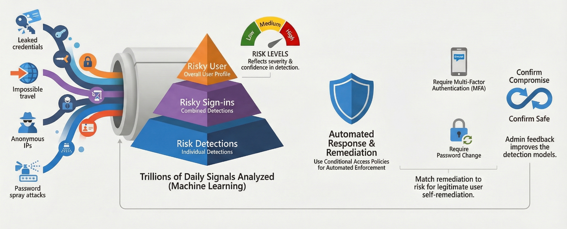 Microsoft phân tích hàng nghìn tỉ tín hiệu mỗi ngày từ các dịch vụ của họ như thông tin đăng nhập trên Entra ID, các mối nguy hiểm từ Microsoft Defender, các tín hiệu máy ảo trên Azure, hành vi người dùng trên Microsoft 365,….Bằng cách dựa trên những tín hiệu này, Microsoft xây dựng một đường cơ sở (baseline) những gì gọi là bình thường và những gì đi chệch đi khỏi quỹ đạo đường cơ sở này có thể được xem là rủi ro.