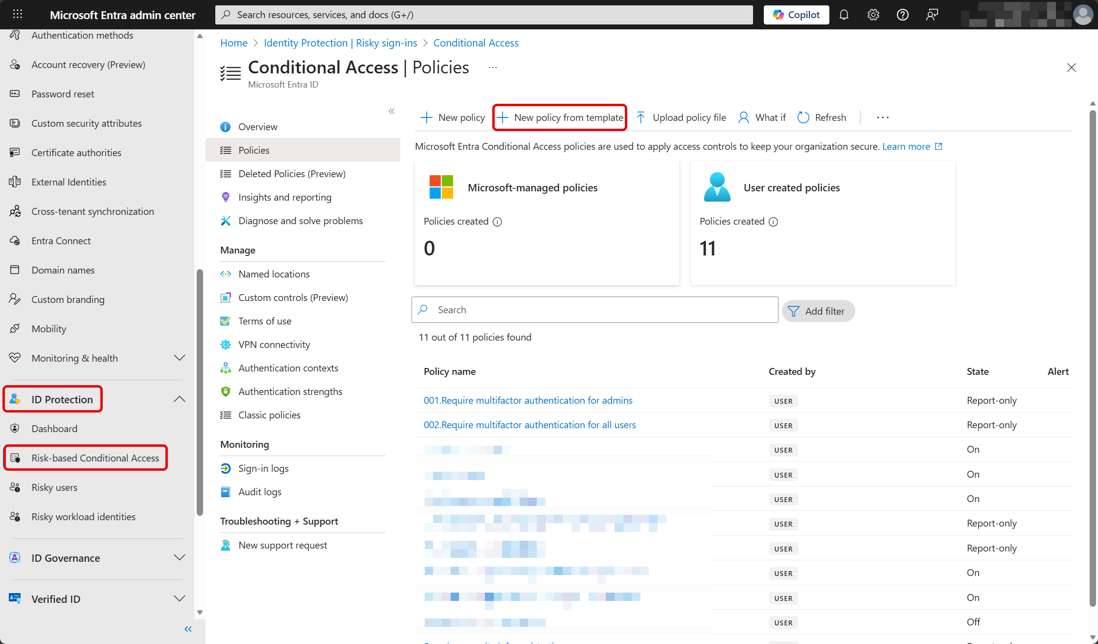 Truy cập Entra Admin Center https://entra.microsoft.com/, chọn ID Protection > Risk-based Conditional Access > New Policy from template.