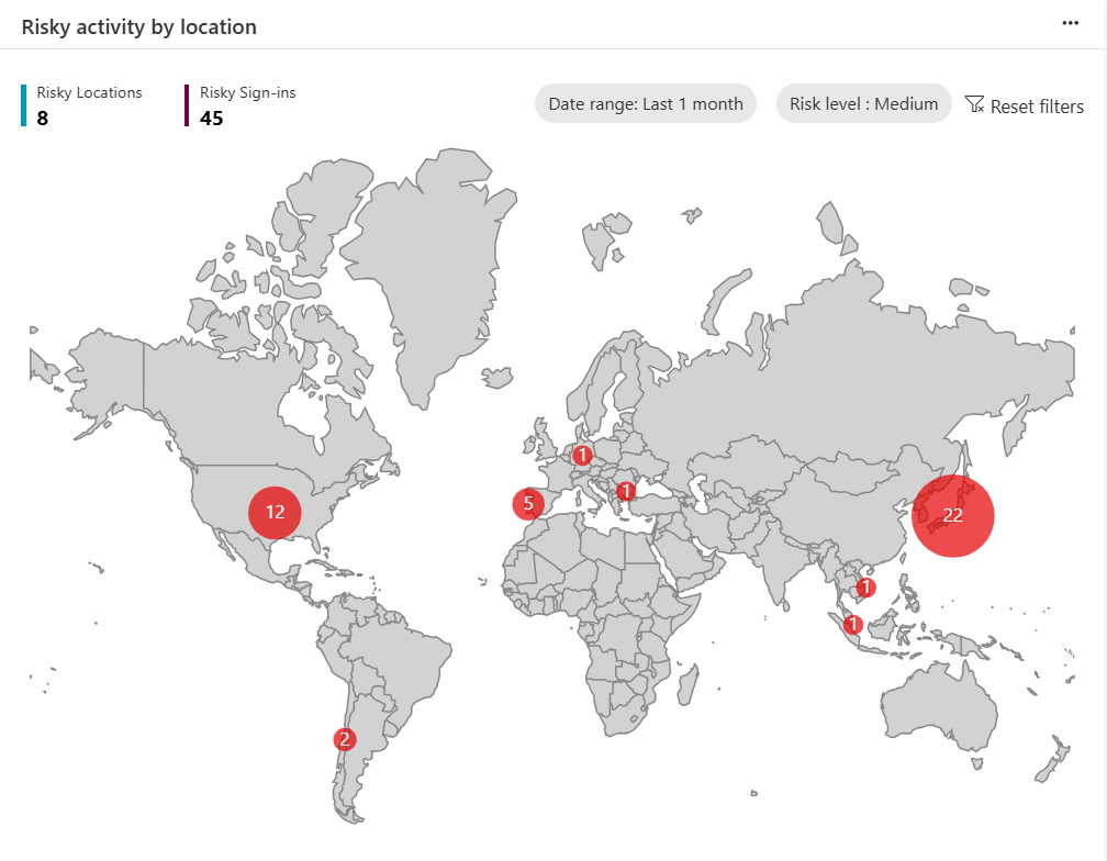 - Dashboard: trang quản lý tổng thể và xem được đầy đủ các thông tin về các cuộc tấn công đã ngăn chặn được (number of attacks blocked); thời gian trung bình để xử lý/khắc phục các người dùng có rủi ro cao (Mean time to remediate high risk users), số lượng người dùng đã bảo vệ được (Number of users protected); số lượng người dùng rủi ro cao (Number of high risk users); các đề xuất (Recommendations); các hoạt động rủi ro theo vị trí địa lý (risky activity by location)