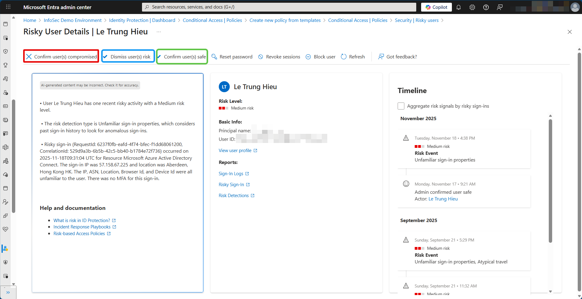 - Dismiss user(s) risk: Xác nhận an toàn để báo cho hệ thống biết đây là một báo động giả (false positive)