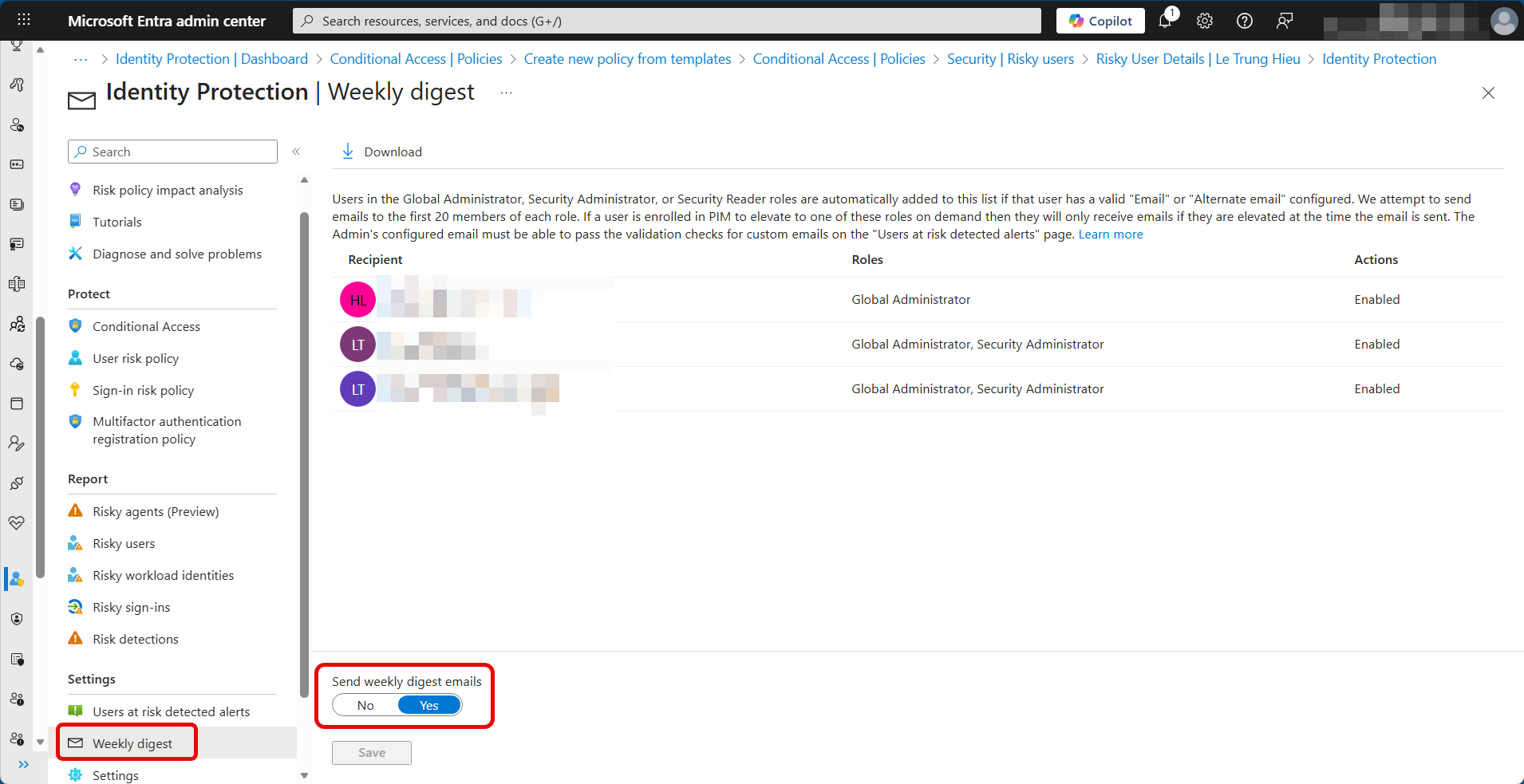 Mỗi tuần một báo cáo tổng hợp sẽ được gửi đến quản trị viên. Truy cập Identity protection chọn Settings > Weekly digest. Mặc định tất cả người dùng Global Admin, Security Admin, Security Reader sẽ nhận thông báo này. Có thể chuyển trạng thái từ Enabled sang Disabled để không nhận email cho từng người cụ thể; hoặc kích hoạt tùy chọn Send weekly digest emails sang No để không nhận email. Đề xuất luôn nhận email để hiểu rõ hơn trạng thái bảo mật danh tính của tổ chức.